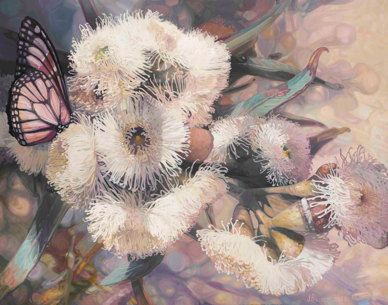 One particular day while taking these photographs, the light falling across the gum flowers was soft and the magical feeling was complete when quietly the butterfly in the painting made its home in the haze of flowers.